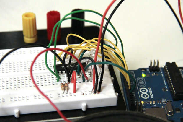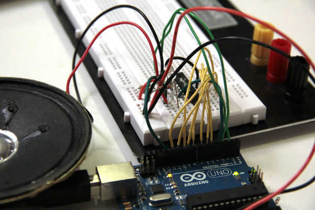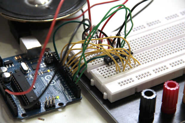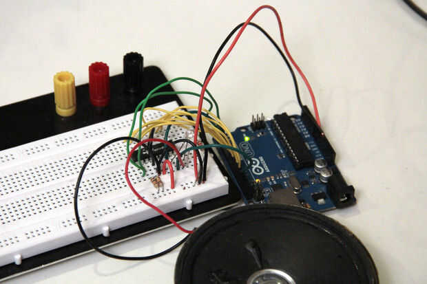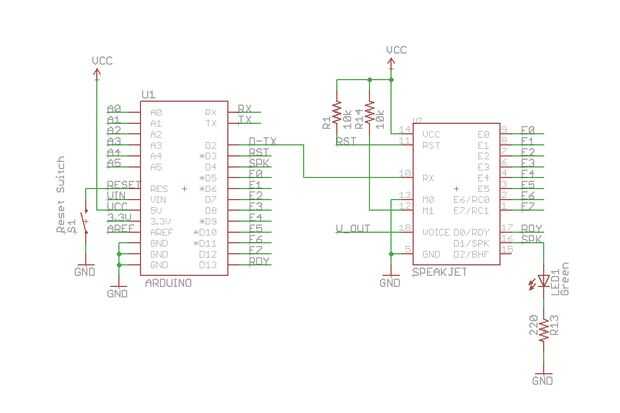 Cuando usted conectar el circuito y cargar el código de abajo (escrito por la gente de Sparkfun), dirá el SpeakJet "listo" después de la salida el mensaje «todas su base son nos pertenecen» voz de Robot-hablar seguido por algunos pitidos de R2D2-esque y luz verde LED conectado al pin 16. (Por supuesto, usted necesitará conectar un altavoz entre pin 18 de SpeakJet, denominado "V_OUT" en el esquema anterior y GND para escuchar este mensaje). Que utiliza un altavoz de 8 Ohm pequeño y sólo oí el mensaje muy débilmente (por esta razón es buena para finalmente amplificar la salida del SpeakJet antes de enviarlo a los altavoces). Pulsa el botón de reset de Arduino (Fig. 4) para escuchar el mensaje tantas veces como quieras.