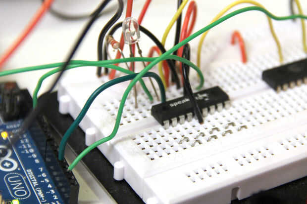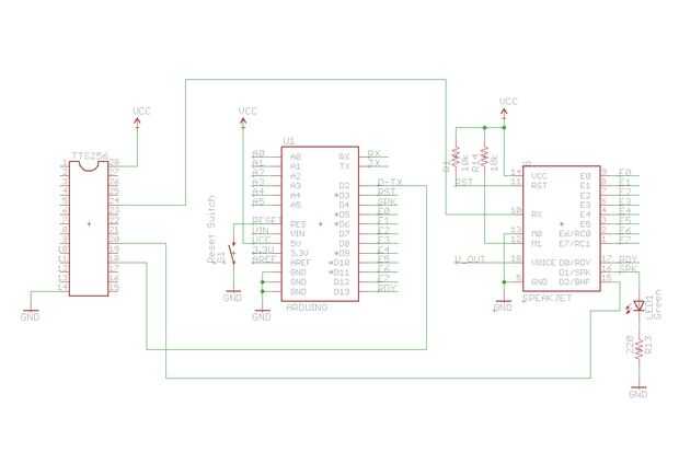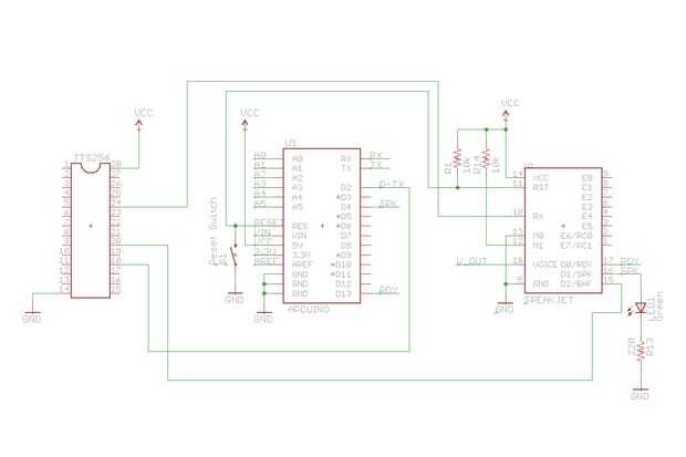 He seguido libremente las direcciones encontraron en el sitio web de Sparkfun para poner el TTS256 en marcha con el SpeakJet. Conexión de 5V para pin 28 y tierra al pin 14 de la TTS256. A continuación Desconecte la conexión entre el pin digital 2 de Arduino y el pin 10 del SpeakJet. Conectar pin digital 2 al pin 18 de la TTS256 en su lugar. Conectar el pin 24 de la TTS256 al pin 10 del SpeakJet. Conecte el Pin 20 de la TTS256 al pin 15 del SpeakJet. En la fig 2 se muestra un esquema, e higos 1, 3, 4 y 5 muestran el circuito en un protoboard. Ahora que tienes la configuración del hardware, cargar el código siguiente. Usted debe oír el SpeakJet salida de la palabra "listo" cuando se hace reposición, entonces que es la salida de cualquier mensaje encapsula en la línea: