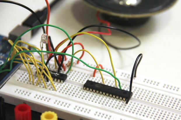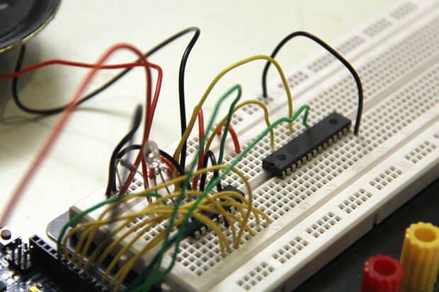 Usted puede haber notado en este código que ya no se utilizan los pines E0-E7 (los cables amarillos), se encuentra baja y baja sostenido mientras el TTS256 envía los datos al SpeakJet. Dejé estas conexiones bc no quería confundir a usted antes, pero si está funcionando el código anterior, entonces puede seguir adelante y desconectar estos pines de Arduino y sujete permanentemente a tierra. Esto liberará muchos de los pines de Arduino para otras cosas. También puede colocar pin de reset de SpeakJet directamente al reset de Arduino (cerca de los pines de alimentación), previamente fue conectado al pin digital 3. He incluido un esquema (Fig. 6) y algunos protoboard fotos (figs. 7 y 8). Ahora sólo debe haber tres conexiones entre los pines de datos de Arduinos y el SpeakJet/TTS256: