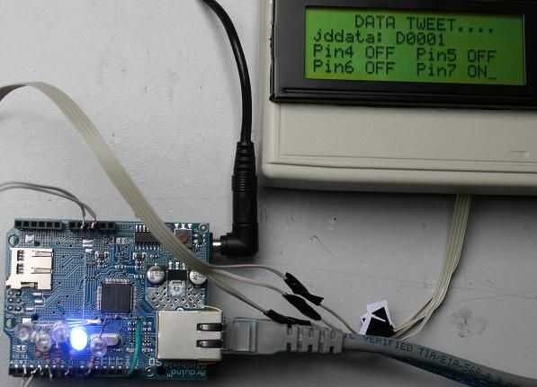 Así que aquí Digital salida que pin7 (en la secuencia de patillas 4,5,6,7) es activada según el tweet de "datos" que acaba de recibir, así 4 LED de la izquierda (conectada al Pin7) es de hecho enciende como se puede ver... funciona.