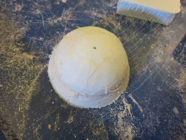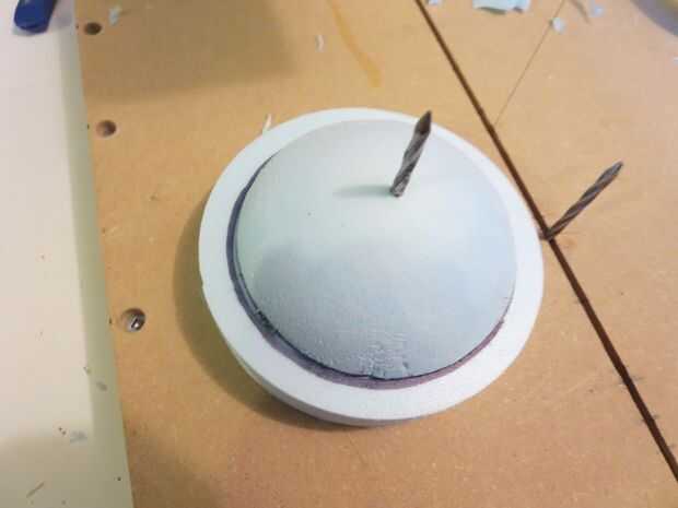 Hice la cabeza por esculpir la espuma del aislamiento, sin embargo yo recomendaría comprar una esfera de espuma de poliestireno de 10 cm diámetro de una tienda de artesanía y corte por la mitad. Si usted decide hacer esto Asegúrese de que la pintura que está utilizando no derrita.
