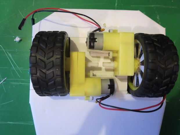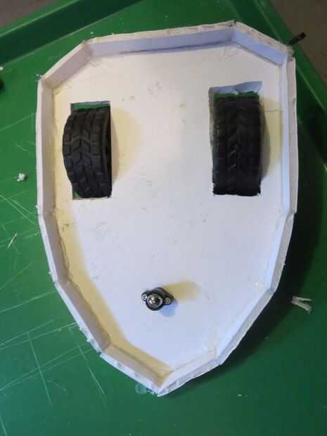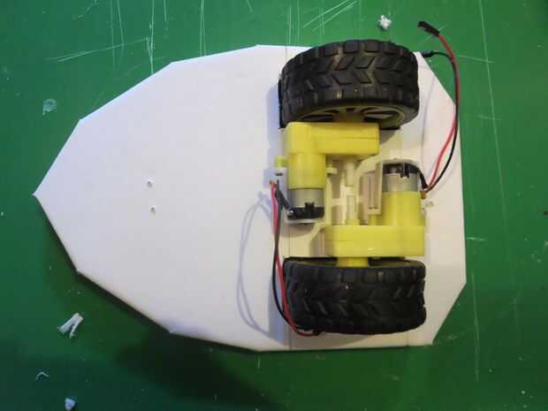 Es el primer paso en la creación de la base para montar los motores, pero antes de hacerlo debe pintarlo. Empiece por encontrar y marcar donde quieres los motores para ir. Después de que usted haya calculado hacia fuera, marque y luego corte los agujeros para las ruedas. Acabado de la base de montaje de los motores y agregar un lanzador de bola pequeña a la parte delantera de la base. Ahora puede probar la base a enganchar hasta una verruga de la batería/de la pared y asegurándose de que todo funciona correctamente.