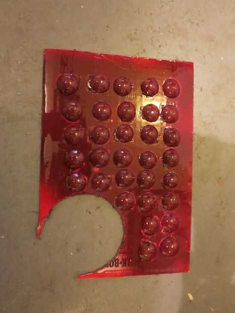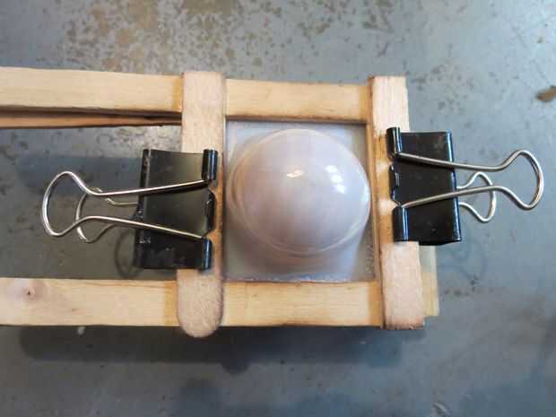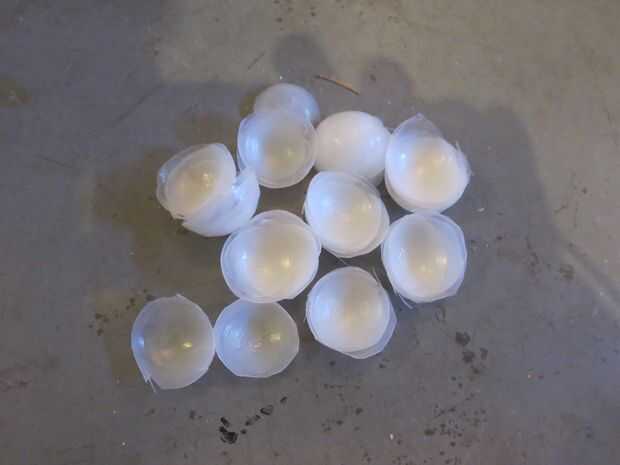 Para realizar la falda tendrá que comprar/hacer 56 hemisferios. La forma más sencilla de hacer esto es acabo de comprar unos 3/4" madera hemisferios. Decidí formar fuera de plástico y jarras de leche, sin embargo no recomiendo esto ya que es tedioso y consume mucho tiempo. Después de haber obtenido los hemisferios se necesita pintarlas y luego pegarlos a la falda como se muestra.