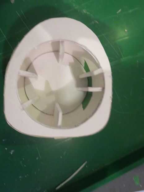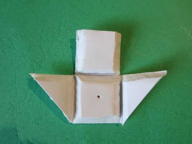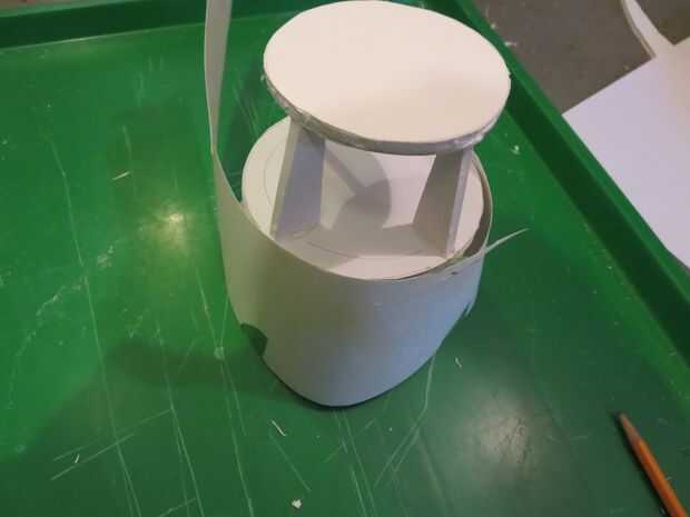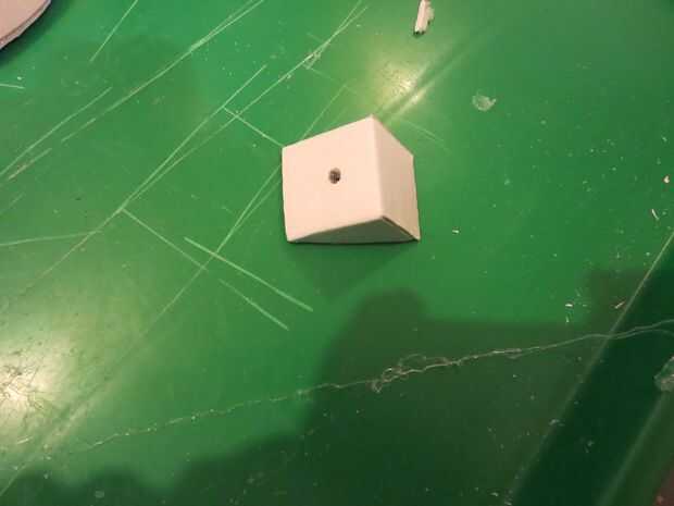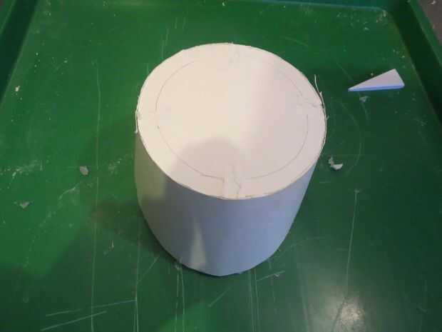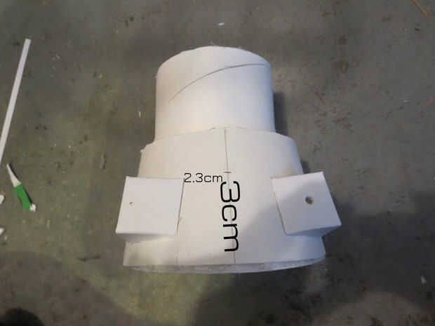 Una vez que la parte central de espuma de los hombros pegados juntos, comenzar a cubrirla con cartulina. Esta parte es algo difícil de hacer, la mejor manera que encontré de hacerlo es comenzar cinta adhesiva la cartulina a la base de la base de la espuma y el combeo lentamente, marcando y cortando entonces como vas. Una vez que ha hecho se necesita cortar y marcar el patrón que se muestra en la foto 4. Luego pegarlos en la sección del hombro como se muestra en el cuadro quinto.