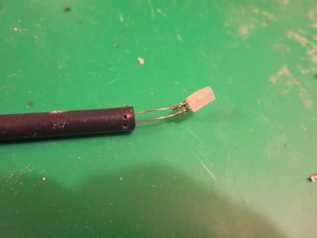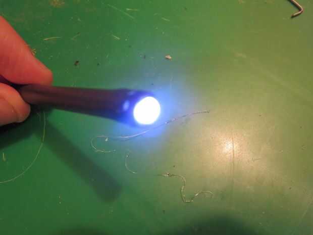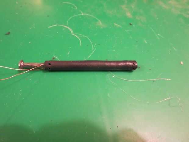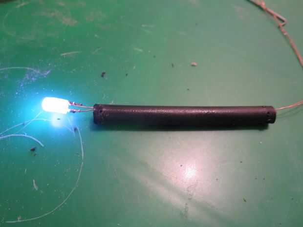 La base de la pistola está hecha de 1/4" tubería con un clavo alimentado aunque él. Comience por llenar un blanco conducido por lo que se ajusta a 1/4" tubería. A continuación el corte de una longitud de 6 cm de tubería de 1/4, entonces necesitará hacer 8 agujeros uniformemente espaciados unos 5mm de cada extremo (Foto 2). La forma más fácil para hacer los agujeros es calentar un trozo de alambre con un encendedor y usan para derretir los agujeros. Luego cortar algunos cables para que quepan entre los agujeros en los extremos de la tubería (foto 7, 8) de la curva. Una vez que se ha hecho, cortar la punta y la cabeza de un clavo afilado que funciona mejor. El último paso es presionar la uña con algún alambre fino deformado alrededor de él en el tubo (foto 6), soldadura de los extremos del alambre a los led (Foto 5) y finalmente pegamento todo el cable en su lugar (último algunas fotos).