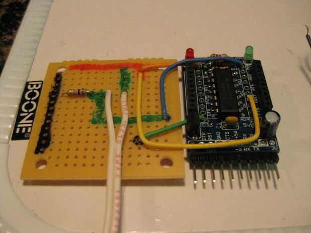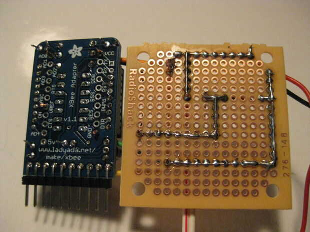 Si nos fijamos en las imágenes de arriba, las líneas rojas y negras marcan los positivo y negativo respectivamente. La conexión verde son las conexiones comunes a todos. El cable amarillo y el naranja vaya a la Vref y Vcc de lo XBee y conectar al bus positivo. El cable verde se conecta a GND en el XBee y va al grupo del autobús. Y el cable azul se conecta a AD0 en el XBee y se conecta entre el FSR y el resistor de 10 K Ohm.