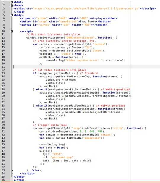 Este es el código que nos permitirá tomar fotos con la webcam. (Asegúrese de quitar todos los * s, están aquí sólo para mantener el código de formato automático)