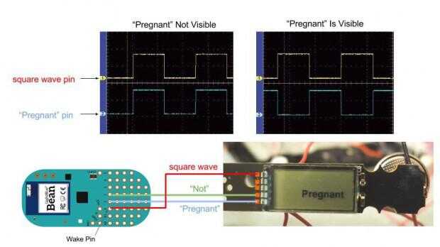Puesto que sólo pretendo controlar el "no" y los iconos de "Embarazada", solo me falta 4 hilos: no, embarazada, reloj y la tierra. Estoy usando un grano de luz azul para el microcontrolador, que también cuenta con un transceptor Bluetooth Low Energy.
