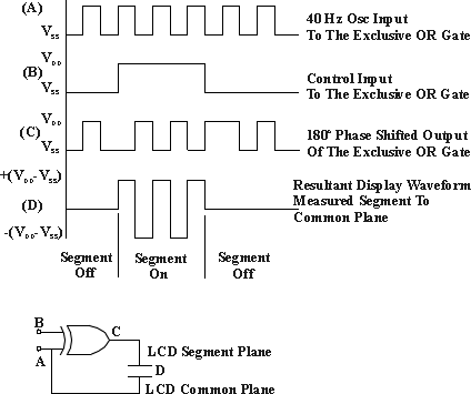 Los pernos que son fácilmente accesibles en la prueba de embarazo LCD están en la salida de la XOR. Así que cuando el icono esté encendido, eso Perno Ve el medio ciclo fase cambiada de puesto salida en relación con la forma de onda normal "reloj". Con la unidad en modo de disco, fue fácil identificar el pin de reloj (A) así como las clavijas de cada icono (C).