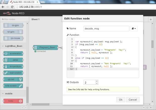 Sucede que tiene unas luces que son controlados vía MQTT y OpenHAB. En el video de la demo, puede ver la lámpara de sobremesa encenderá cuando el resultado es "Embarazada". La lámpara se apaga cuando está "No embarazada". La función parece no está haciendo nada, pero es necesario debido a algunas rarezas con OpenHAB no captura MQTT publica sin \n. El arreglo de facilita visualmente excluir mensajes de diferentes servicios.