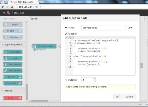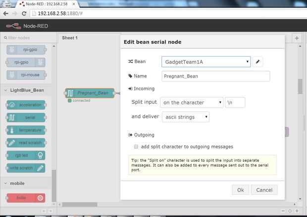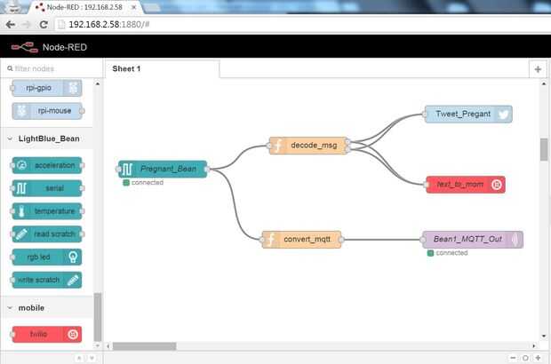 El Bluetooth LE (haba) se comunica con la frambuesa Pi a través de un adaptador USB bluetooth. Estoy usando NodeRED para recibir los datos de Bluetooth y luego los Twilio y Tweeter tweet y mensajes de texto. Vea arriba para los pequeños pedacitos de código para cada nodo.
