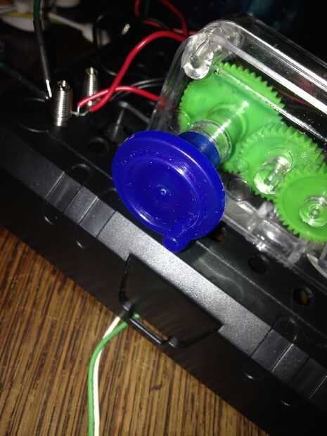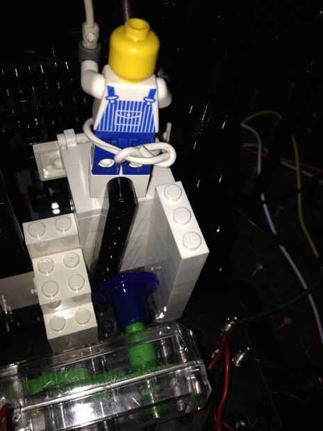 Los motores y la campana fueron rescatados de un kit del motor modular Connex. El engranaje inestable que convierte el movimiento circular en lineal (en este caso, el pequeño minifig activista dudes' arriba y abajo del movimiento de la cuerda de escalada) era un ajuste perfecto para una viga Technic LEGO 5 hoyos. Y las plataformas plásticas que Connex ofrece construir sus kits puede ser anclado a su juguete LEGO colocando el plástico basan sobre una sola fila de clavos en su base. Los motores causan meneo, pero la unidad permanece bloqueada!
