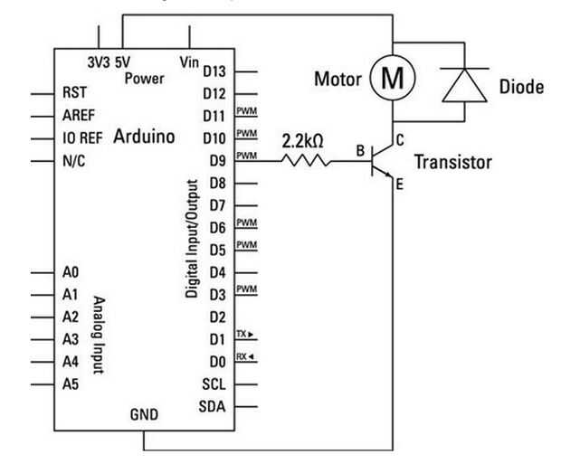 El motor tenía fue diseñado para funcionar con 2 pilas AA, 6 voltios, pero el 5 de Arduino está dentro de especificaciones. Usted no puede iniciar y detener el circuito de 5 volts directamente, quiere poner ese circuito de transistor pequeño allí para actuar como una puerta. Es como un interruptor en la posición de apagado cuando no hay voltaje del pin 9, por lo que no funciona el circuito de 5 voltios. Sin embargo, poner una señal digital a la base del transistor, y la corriente va de colector a emisor.