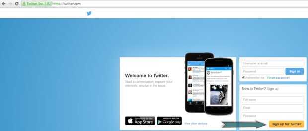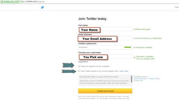 Ir a twitter.com y haga clic en "Regístrate para Twitter." A continuación, llene el formulario. Yo las dos cajas al final, como no quiero permanecer registrado, y no quiero Twitter conocer mis hábitos de navegación.