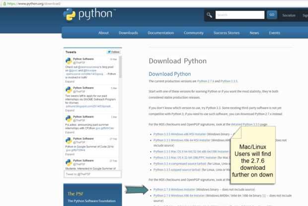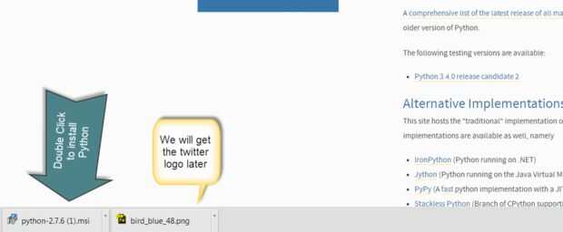 Haga doble clic en el Python 2.7 versión (actualmente 2.7.6) para windows installer, va a descargar (en Chrome se descarga en la parte inferior izquierda del navegador, Firefox tiene la flecha verde en la parte superior derecha de la ventana del navegador), si tienes una caja de Mac o Linux, las descargas están más abajo en la página.