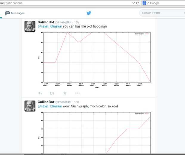 Este bot puede registrar datos y tweet parcelas a intervalos configurables. Los datos que debe ser registrado y posteriormente trazar están configurable por el usuario y por lo tanto, puede registrar cualquier dato que usted desee en registro y parcela.