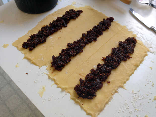 Ahora colocar tres tiras de mermelada encima de la masa; Éstos forman los centros de la Fig Newt Gingriches. Trabajar tan rápido como sea posible, como la masa se volverá mucho menos manejable ha calentado.