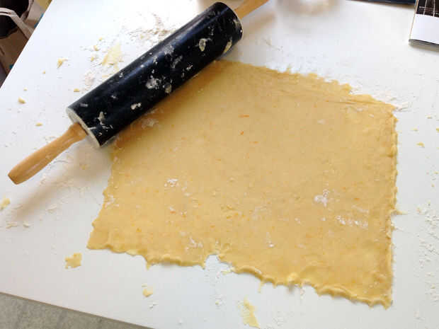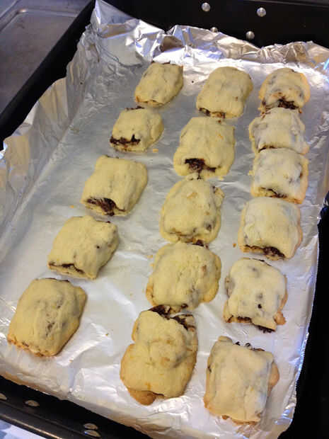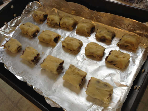 Cortar la masa en tres tiras iguales, luego dóblela alrededor de la mermelada para hacer tres largos rollos de masa llena de mermelada. Picar en trozos pequeños y extienda en una bandeja de hornear engrasada.