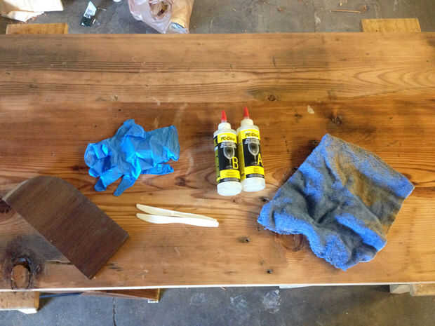Mientras que Doug Fir es un madera más blanda, por lo general, es todavía blando y a menudo muy lleno de nudos. Puesto que se trataba de salvamento, esta fue compuesta por los agujeros de clavo y otros daños. Usé un epoxy (relativamente) barato llamado PC claro que es un simple mezcla de resina/endurecedor de 50-50 nudos y agujeros para clavos. Uso un poco de pintores cinta debajo si el agujero atraviesa la profundidad de la tapa de tabla, a continuación, llenar poco a poco en capas para asegurarse de que no queden espacios de aire dentro de la profundidad del agujero. Siempre utilice guantes y utilizar en un área bien ventilada. Encontré cubiertos de plástico o desechables cuchillos de masilla plásticas funcionados bien para mezclar y aplicar el epoxi.