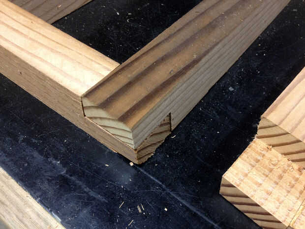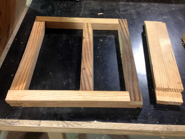 Utilice la Sierra de mesa y un calibrador de trineo o inglete corte transversal para cortar juntas de regazo en el extremo de cada travesaño vertical y superior e inferior. Prueba de la altura de la hoja en un pedazo de chatarra primero antes comprometerse a cortar las piezas finales. Las vueltas deben ser 1-1/2" de ancho por 3/4" de grosor. No tengo un dado configurado así que sólo corrió los empalmes de la hoja de un montón de veces y noqueado a la basura con un cincel.