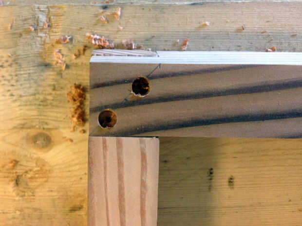 Coloque cada tornillo para una apariencia limpia y avellanado con un 3/8" pieza Forstner. Perfore con un piloto de 1/8 bits, aplique el pegamento a todas las superficies de acoplamiento y unir con tornillos de drywall de 1-1/4".