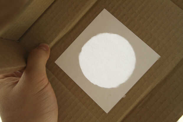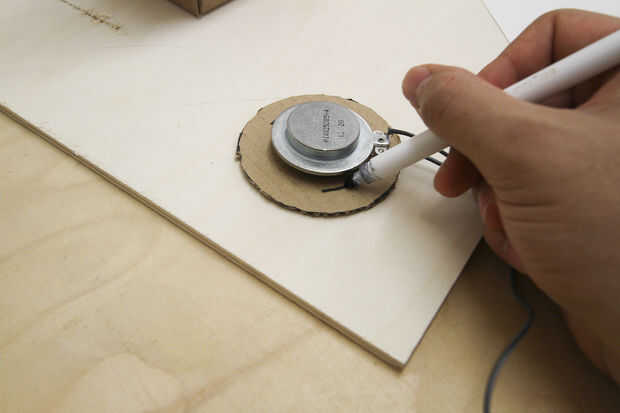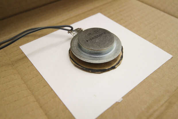 3. una vez que el excitador es asegurado en el disco de cartón utilice dos tiras de cinta de doble cara para fijar el excitador con el disco de cartón en el interior de la caja. Asegúrese de que se sienta Plaza en medio de la membrana de papel. Si usted no puede hacer el centro de la abertura sólo sostenga la caja contra una fuente de luz, para revelar el tamaño de la abertura.