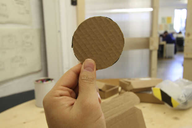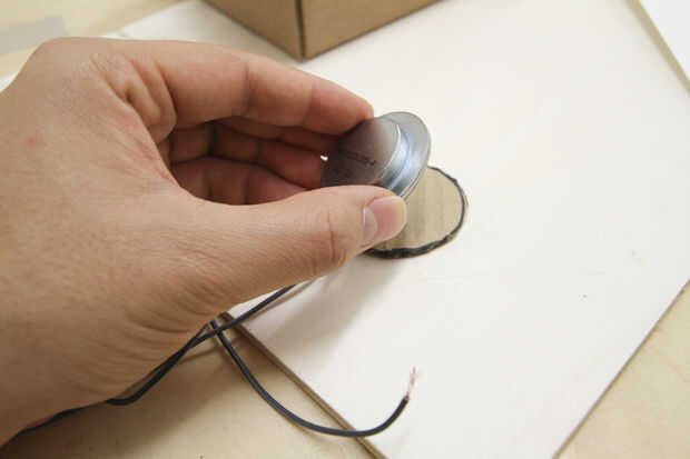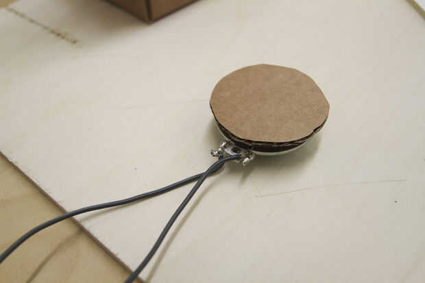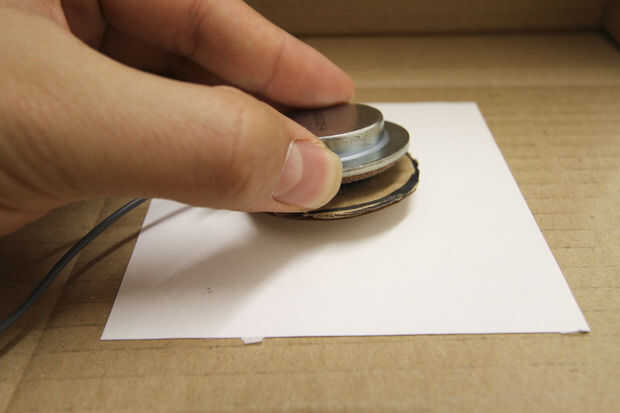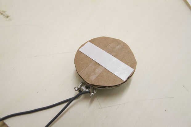 1. Qué tenemos que hacer ahora es hacer el disco de cartón un poco más pequeño cortando material suficiente para dar el excitador suficiente espacio para sentarse. Se puede jugar con el radio del disco de cartón a ver cómo esto cambia la calidad del sonido. Para mí tener el disco de cartón con un radio ligeramente mayor que el excitador sí mismo resultó para ser la mejor opción.