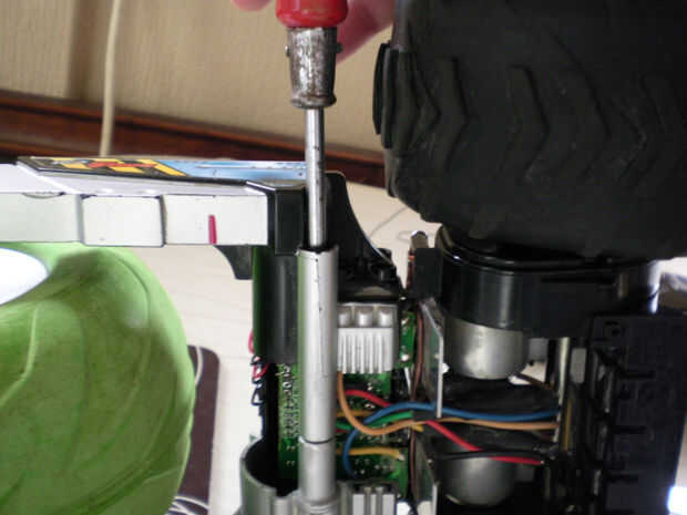 Antes de llegar a ese paso debe ir una cabeza y vuelva a colocar la rueda grande, de lo contrario cuando vayas a utilizar tu robot a salir de control y se rompa tu arduino debido a menos peso que sostiene el chasis en su lugar.