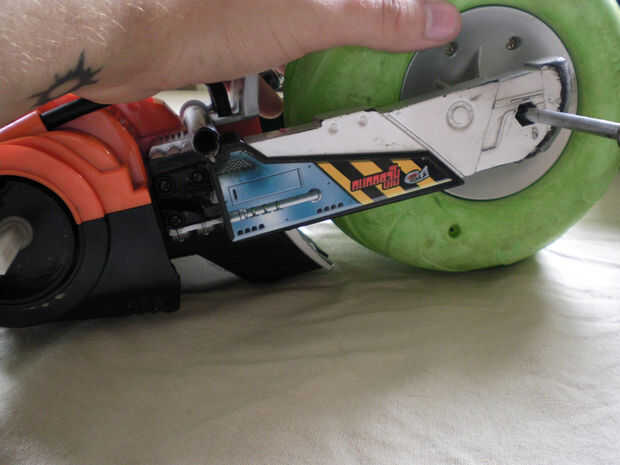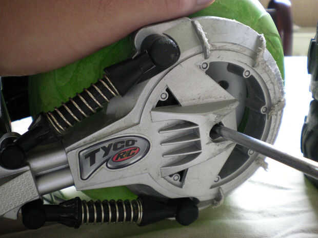 Veremos cinco tornillos (cuatro en una plaza) y uno en un agujero profundo quitar todos los tornillos y retire suavemente la barra lateral y la rueda principal.