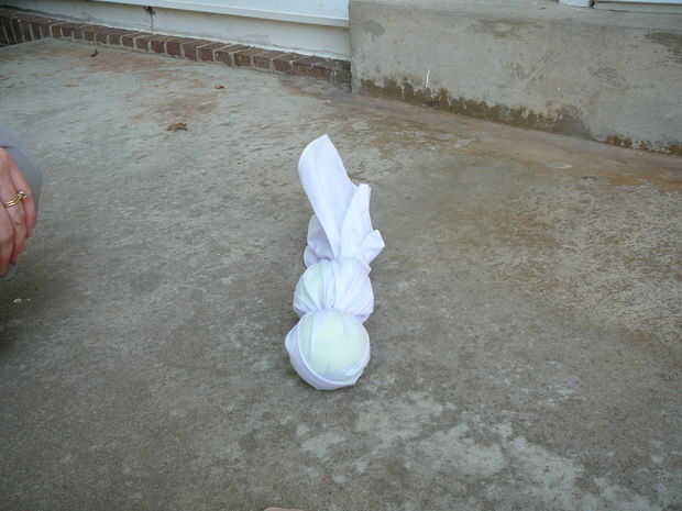 Tomar el pañuelo pelotas tennis\ping-pong y bandas de goma. Por cierto que uno use una tenis bola, si quieres dos anillos uso dos pelotas de tenis y así sucesivamente. Si vas a usar más de tres bolas, recomiendo bolas de ping-bong. Poner la ball(s) en el medio si está usando uno, o poner las bolas en menos de dos pulgadas de distancia. Luego agarra a la tela alrededor de la bola y atar la goma muy cerca de la bola, si hay que espacio suficiente pone gomas más cada dos pulgadas o menos. Si hay más bolas de hacen lo mismo a ellos.