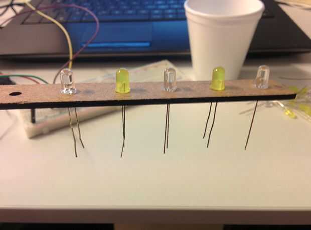 Usted necesita tener cuidado al colocar LEDs en los agujeros. Si no pones cátodos (-(pata corta)) en un lado, conectar/soldadura les será mucho más difícil.