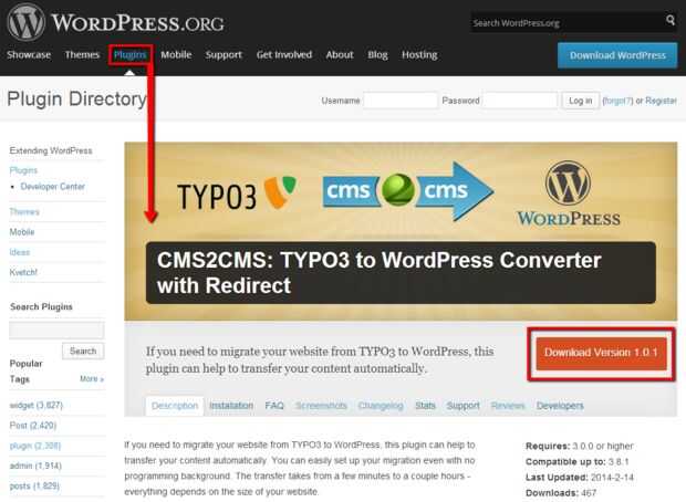 1. el primer paso es ir al repositorio oficial de WordPress, encontraréis TYPO3 a WordPress con el plugin de redirección y descargar a tu ordenador.