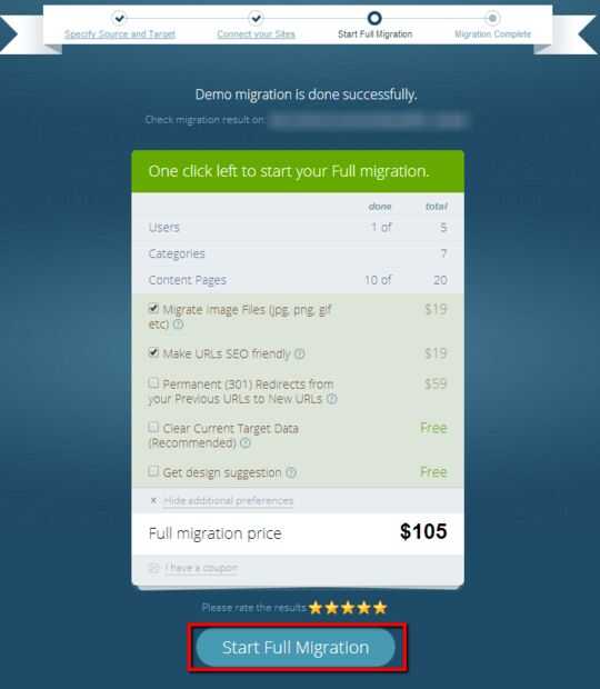 5. ahora es el momento de realizar la migración de la versión parcial de programa y en caso de que usted está satisfecho con sus resultados, puede ejecutar migración completa del sitio Web. Podrá disfrutar de su nuevo sitio web de WordPress en un abrir y cerrar de ojos.