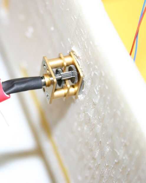 Utilizar tubos de goma de colores (retenedores de gafas) para la cola (y eventualmente la sonrisa).  Empuje el tubo termocontraíble en el tubo de goma de colores.  Reducir la tubería expuesta en el eje del motor de cola.