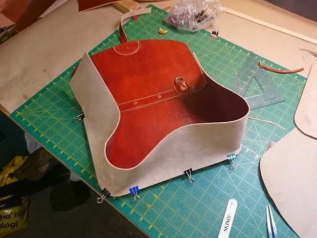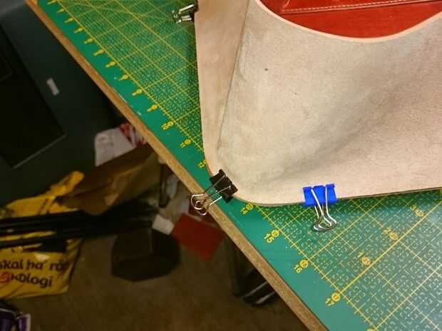 Con todo conectado, estamos listos para coser el fuelle. Pegué en el y utilice pinzas para sujetarla. Entonces marqué los agujeros con un pinchazo hierro y cosido se.