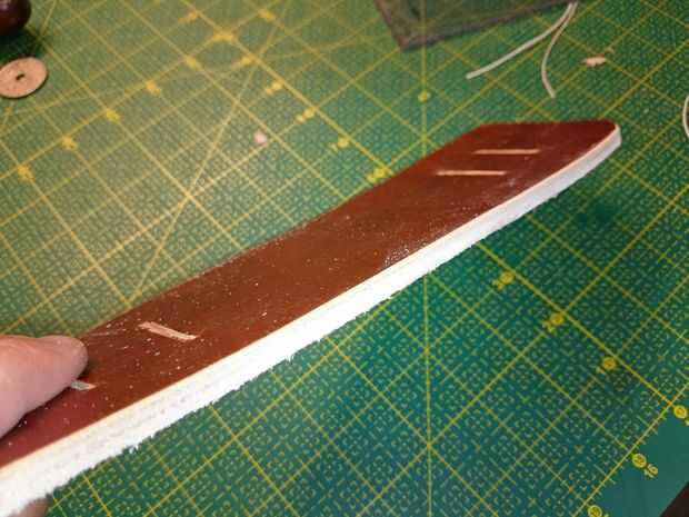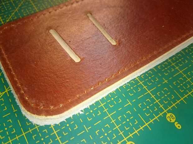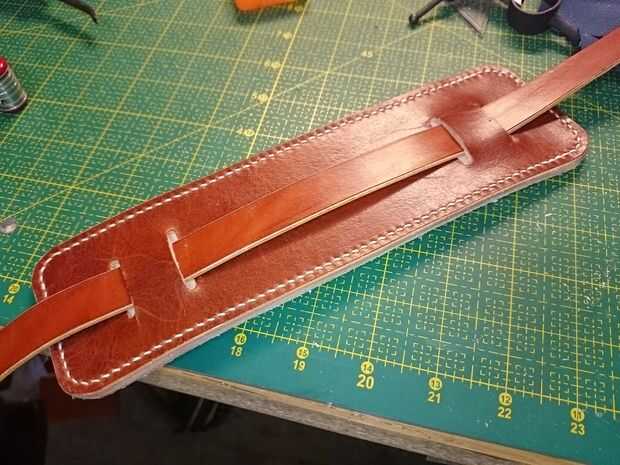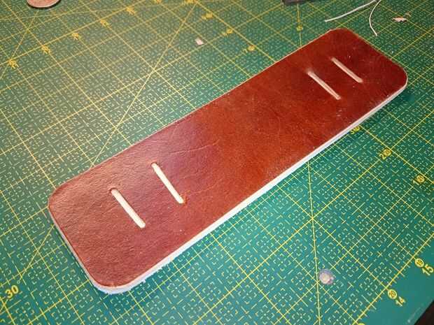 La almohadilla para el hombro se hace de 2 piezas de cuero. La parte inferior está hecha de cuero de 4 mm que tenía de otro proyecto, pero puede utilizar la misma piel que el resto de la bolsa. La parte superior tiene 4 ranuras para la correa.