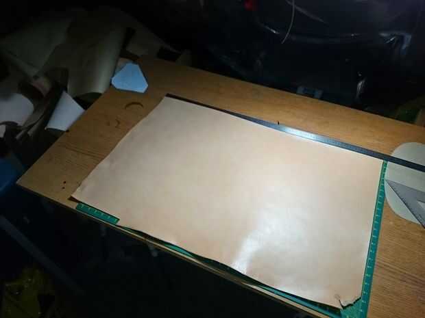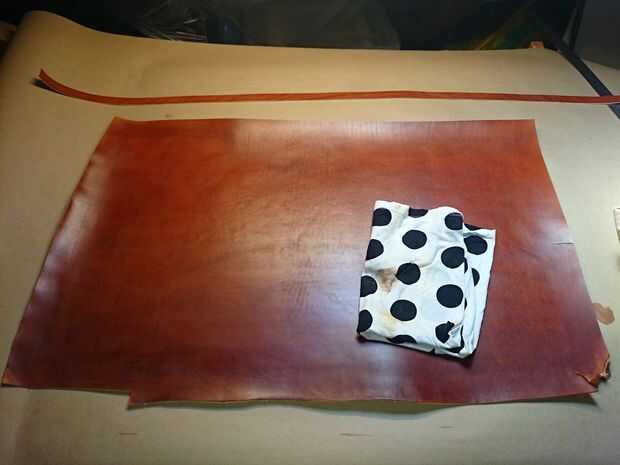 Antes de que el cuero puede ser teñido debe ser cortado a la medida. Para este proyecto se necesita una pieza que es de alrededor de 90 cm x 55 cm. Tinte el cuero antes de cortar las piezas para evitar la deformación ocurre después de que el cuero se haya secado.