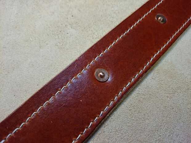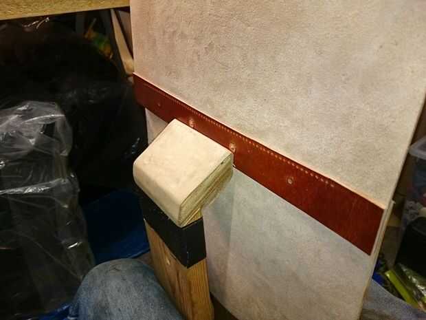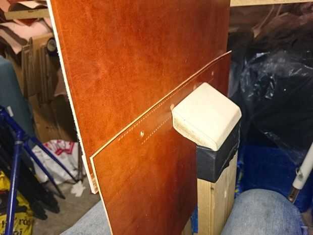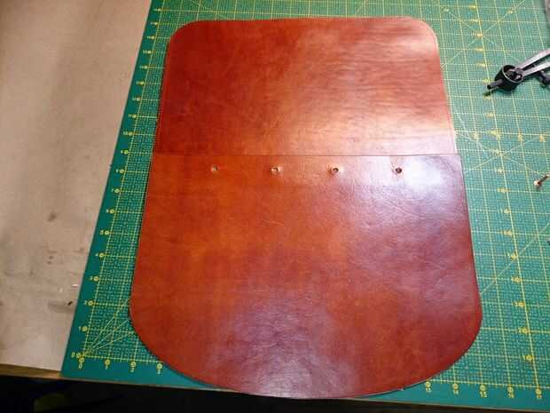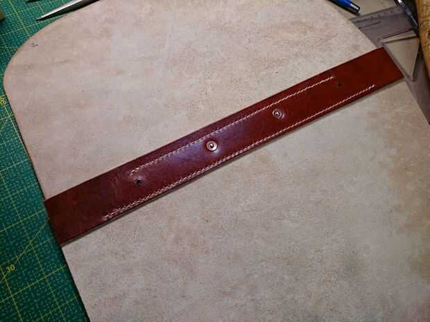 Tomar la tapa y la pieza posterior y pegar junto con una superposición de 4 cm. No pegar la última pocos cm hacia el borde que usted necesita coser el fuelle. También pegar la pieza de apoyo en el interior de la pieza posterior. Sólo hice los primero 4 agujeros como en ese momento no sabia como ahora a colocar desde el borde. Puede seguir adelante y hacer todos los agujeros de 6.
