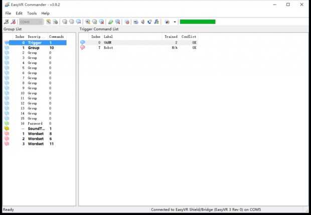 Después de eso, abrir easyVR comandante, encontrar el puerto serie y conectar.