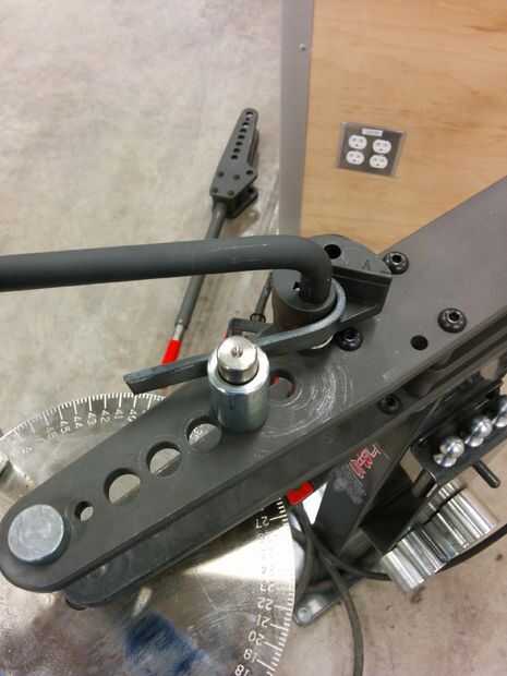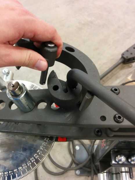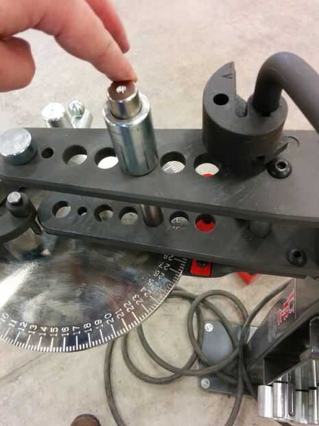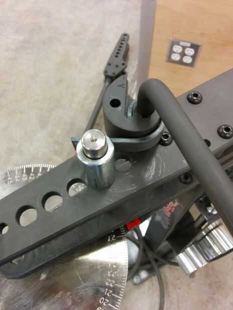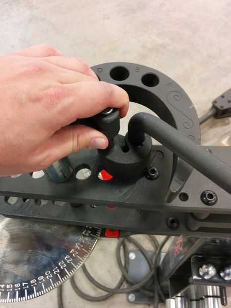 Paso 7. Manteniendo el nivel de acero plano con su mano libre a su vez la manivela hacia la izquierda. Otra vez Asegúrese de mantener el nivel y acero plano apretado. Hasta llegar a donde está marcada la A. Si hay material decir una pulgada o más a la curva adelante y mover la brida del buje de perno y la brida bush uno de los pines lejos. Si no tienes ningún material más y parece que el material va a salir la brida del buje parada! Si ejecuta su material de la arandela de brida se arruinara su desplazamiento.