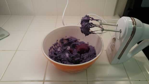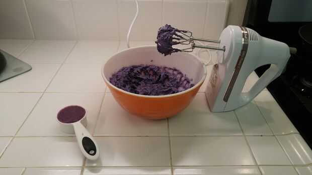 Añadir el huevo y el saborizante de Ube y batir hasta combinar. Añadir la mermelada de Ube y continúe batiendo.