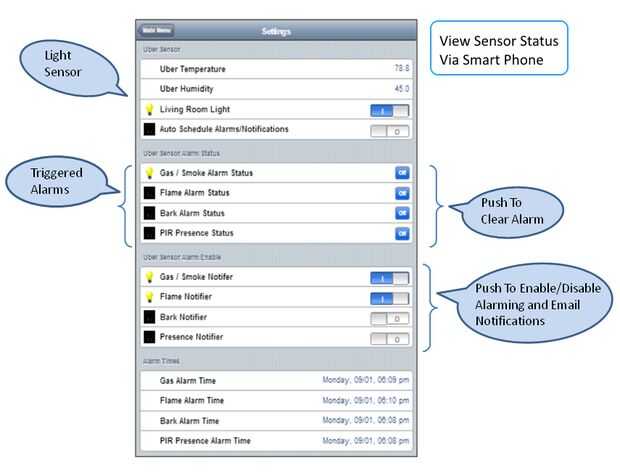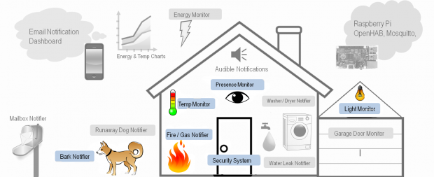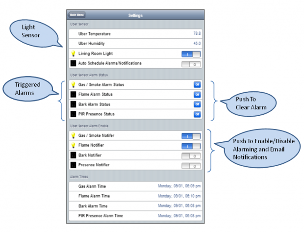 La interfaz de usuario de OpenHAB se ve así. Use su smartphone para acceder a la interfaz de usuario, donde puede activar notificaciones por correo electrónico y alarmante para los sensores que desee. Una vez que la alarma está activada, usted conseguirá un correo electrónico el momento en que el sensor detecta algo.