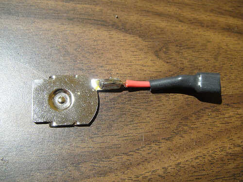 Paso 2:  Corte aproximadamente 1" de cable rojo de la Asamblea de disipador de calor LED.  Soldar un extremo al contacto positivo de la batería.  La encrespadura o uno de los terminales hembra en el otro extremo de la soldadura.  Instalar del encogimiento del calor en el extremo terminal.![]()
