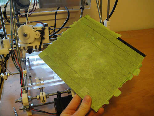• Utilizar una placa intermedia de su cama de impresora 3D. Yo uso un pedazo delgado de policarbonato (lexan). Esta forma, se puede quitar y es más fácil reemplazar la cinta de superficie. También, puede doblar para sacar pegado en estampados que son realmente obstinados.