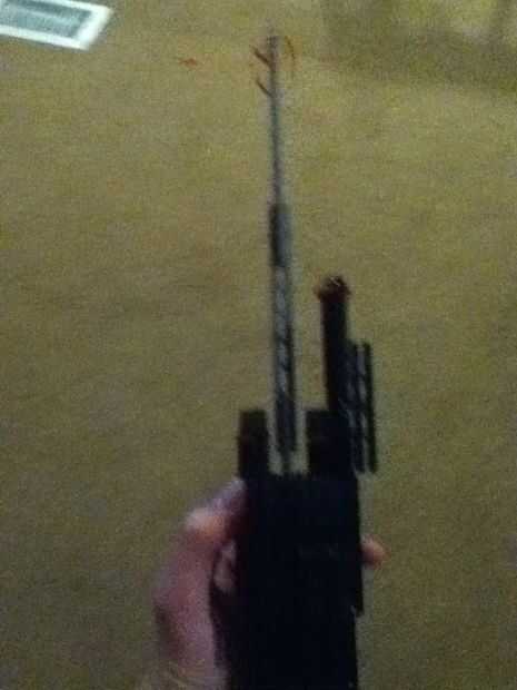 su retráctil pero hay que empujarlo. Triples como una pistola y un cuchillo.Recuerde que este es un diseño muy simplePaso 1: La hoja Solo un conector largo negro.Paso 2: El mangoBasta con mirar la imagen.Paso 3: El lugar donde va la cuchilla. no pude