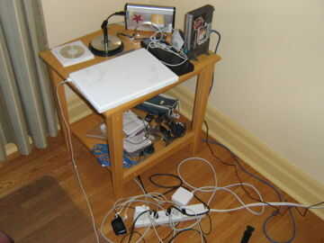 La tabla realmente limpia mi espacio de trabajo y todo lo esconde muy bien. Todo lo que está enchufado es la médula de la barra de energía y el cable Ethernet del router.