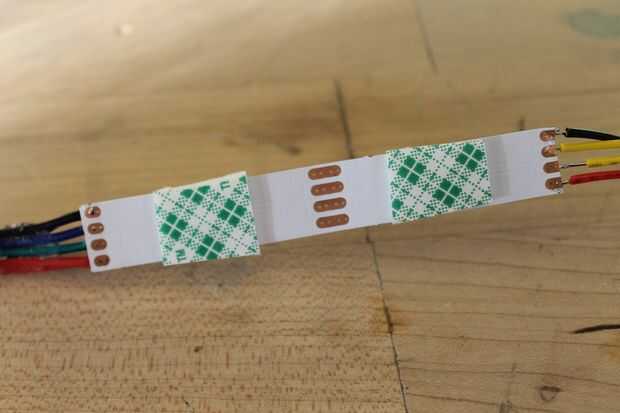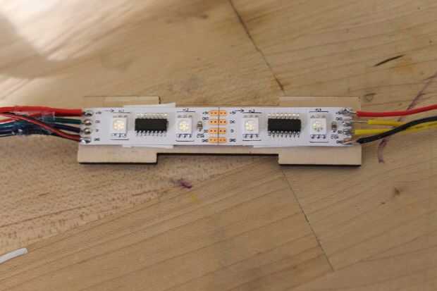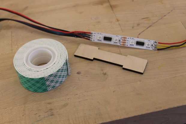 Previamente debe haber cortado a cuatro 'I' en forma de piezas de madera de respaldo. Usando cinta de doble montaje cara, coloque las cuatro secciones de LED a cada una de la piezas del forro de madera. Trate de colocar los LEDs como centrado posible. Aplique un poco de presión cuando haga esto para asegurarse de que las piezas están aseguradas.