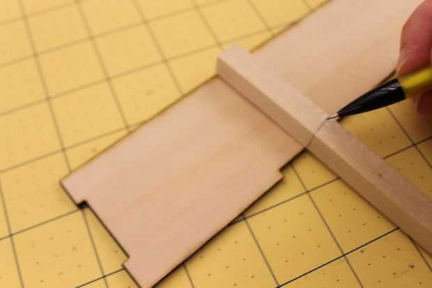 Tomar un taco cuadrado de madera y se coloca en la parte superior de su láser cortar los lados de su marco. Alinee la parte superior de la espiga con el lado plano de la madera y marque una línea donde la espiga se cruza con el interior de la muesca enfrente de la cara plana.