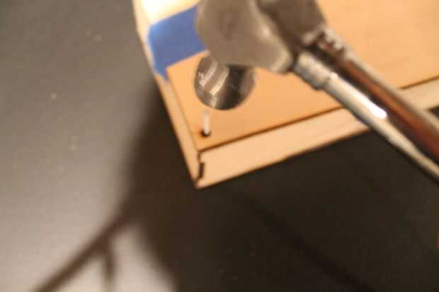 Mediante un pequeño clavo, palillo a través de uno de los orificios de esquina y martillo cerca de la mitad de una pulgada hacia abajo en la espiga de madera abajo. Sacar las uñas y fijar la parte posterior, girando en un #4 1/2" tornillo de madera. Repita para los otros agujeros de tres esquina.
