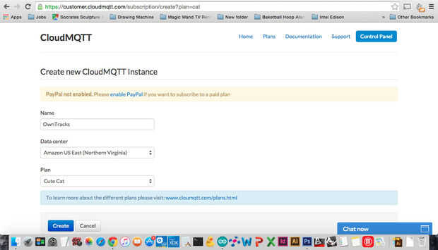 En "Lindo gato", seleccione "prueba ahora gratis". Esto le llevará a una página que quiere crear una nueva instancia de CloudMQTT. En "nombre", elija un nombre para la instancia de CloudMQTT. Puedes nombrar a esto todo lo que quieras. Mina OwnTracks nombré porque es el nombre de la aplicación que vamos a utilizar. No tienes que alterar las otras dos ventanas en esta página, así que una vez que ha elegido un nombre Presione el botón "crear".